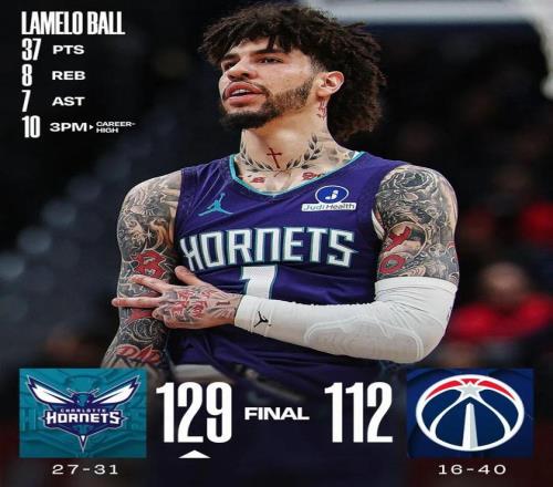 常规赛,黄蜂客场129-112战胜奇才。这场比赛,黄蜂当家球星拉梅洛鲍尔打出了个人赛季最佳表现之一:全场只打了27...
