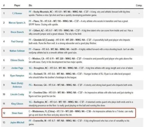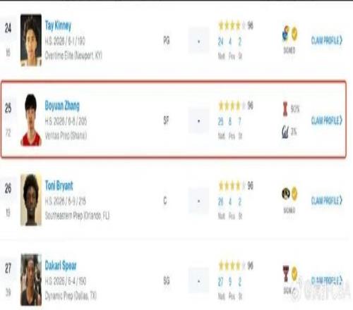 对了,张博源已被多家美国权威体育媒体评为四星高中生,其中选秀网站Rivals发布的2026届全美高中生最新排名中位列全美第25,成为该榜单排名最高的中国球员。