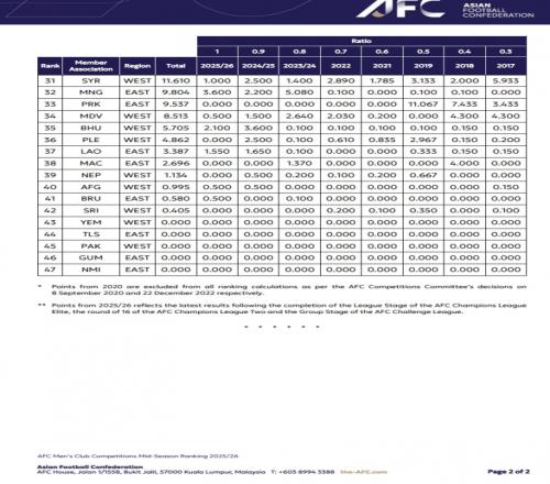 2025/2026赛季亚足联男子俱乐部赛事中期排名榜(前10):