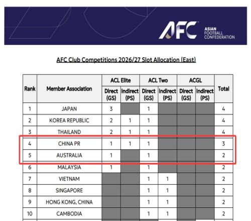 亚足联表示,此次排名榜的更新依据主要是本赛季亚冠精英联赛、亚冠二级联赛暨亚足联挑战联赛的最新战况。目前,中超4队已在亚冠精英及二级联赛中全军覆没,本赛季结束后可能被澳超反超。